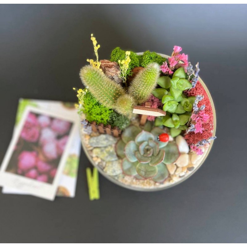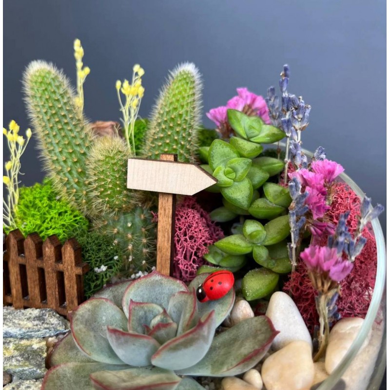 - Флора: Крассула, Эхеверия, Кактус мини в керамике, Кактусы микс