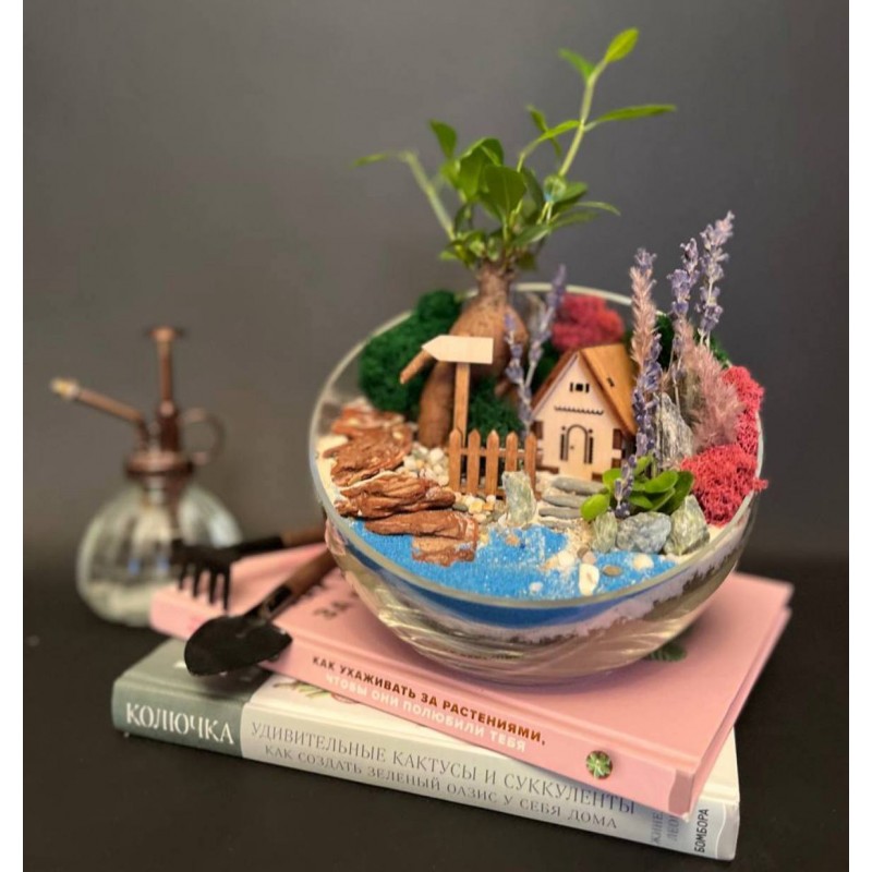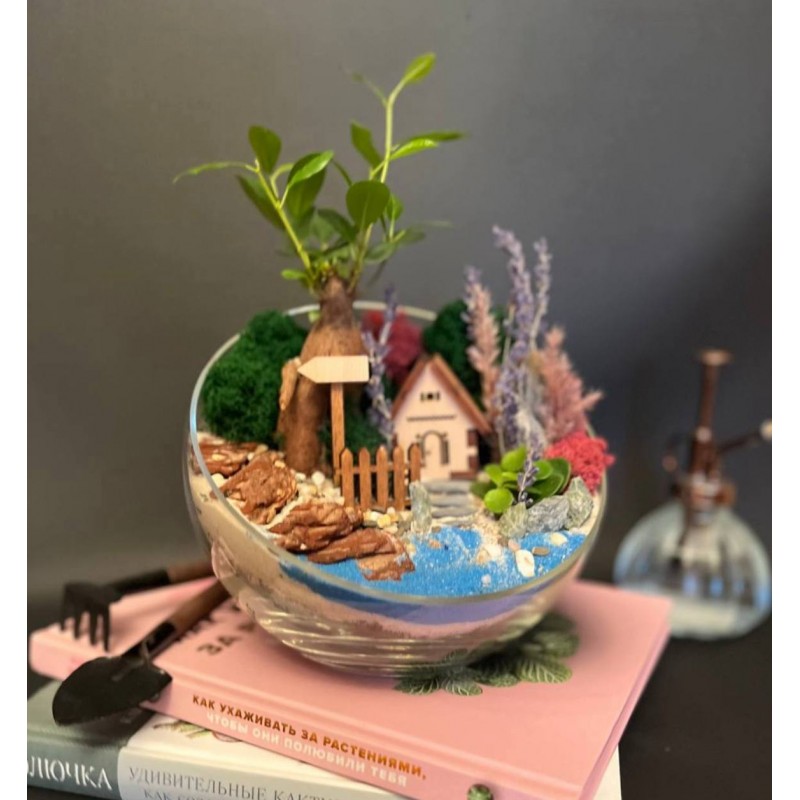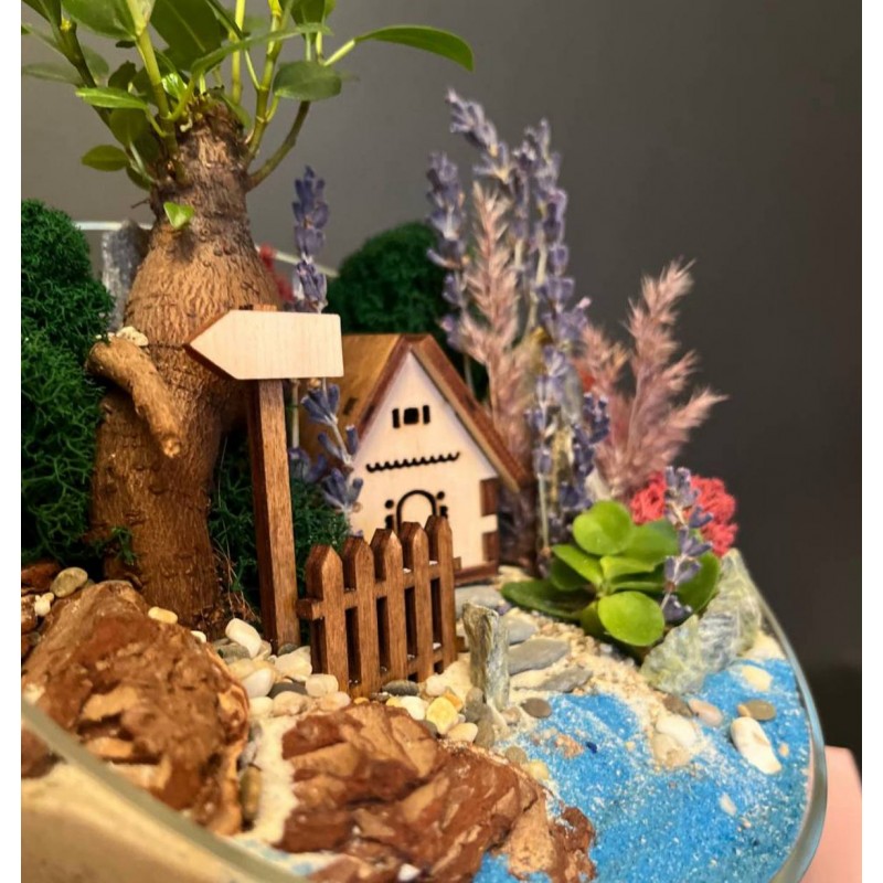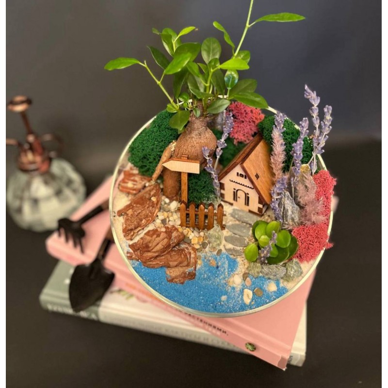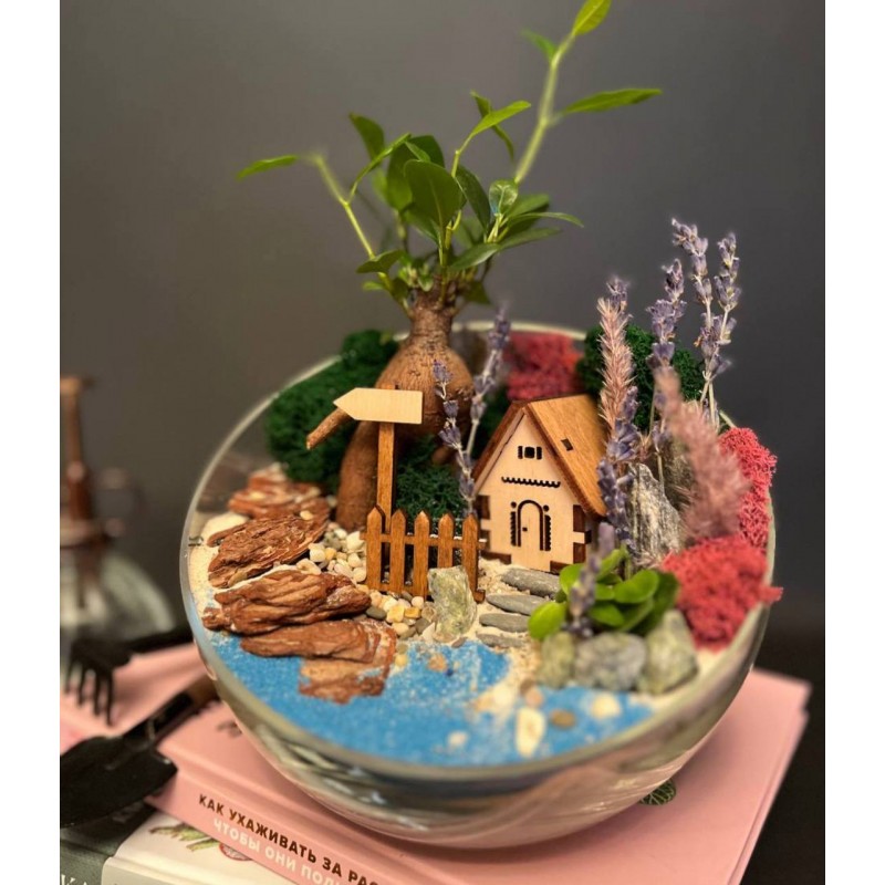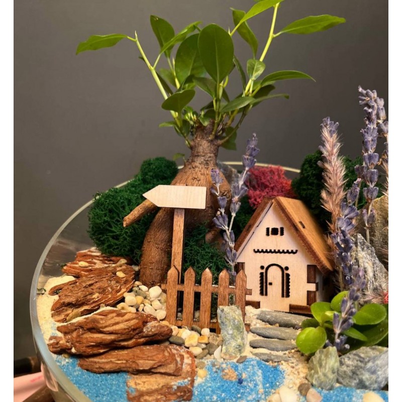 Такой мини-садик подойдет для любителей сочной зелени. Композиция флорариума с фикусом Гинсенг и пеперомией Ротундифолией всегда будет напоминать о тёплых солнечных днях. Сочные оттенки мха ягеля, кора, декоративные посыпки и песок разнообразной фракции создают имитацию прудика и дорожки ведущей в глубь тропических зарослей. Идеальным дополнением данной композиции является деревянный домик и ароматная лаванда. Флорариум станет отличным дополнением и изюминкой в любом интерьере.