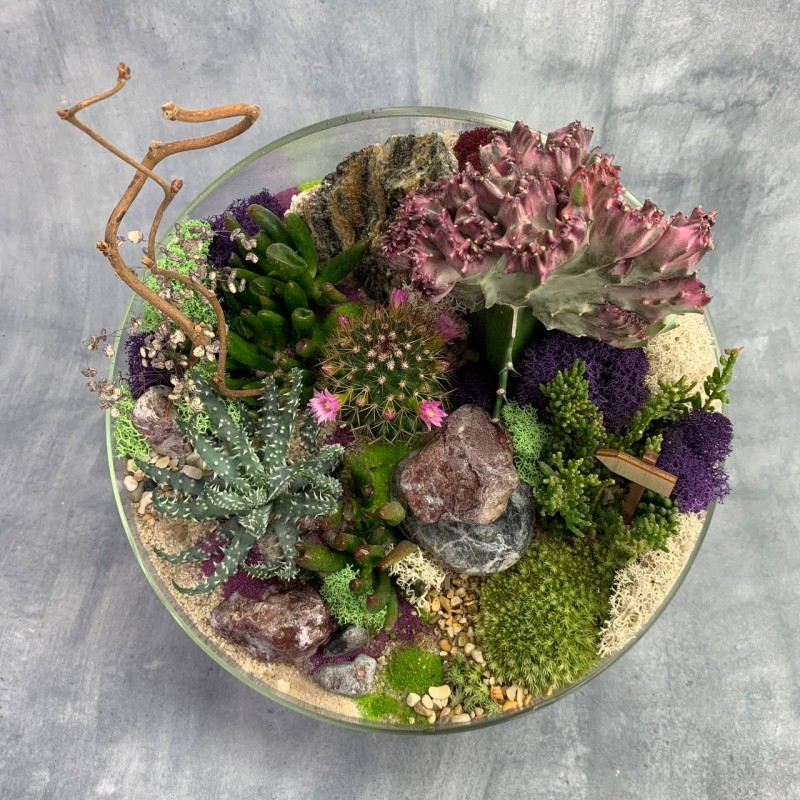 Невероятное сочетание удивительных суккулентов - частичка природы, внесенная в обыденную обстановку наполнит помещение сочными оттенками зелени. Не прихотливые суккуленты в составе композиции подойдут для начинающих цветоводов. Изюминка данного флорариума в невероятной, космической Эуфорбии. Натуральные камушки, кора и сухоцветы отлично дополняют композицию флорариума.
