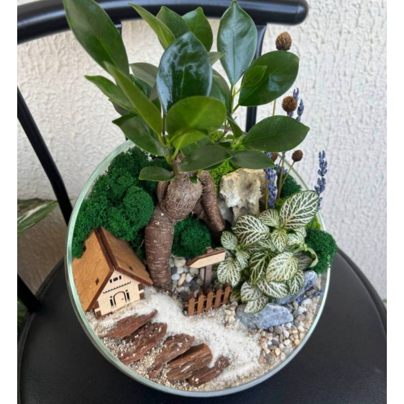 Такой мини-садик подойдет для любителей сочной зелени. Композиция флорариума с фикусом Гинсенг и пеперомией Ротундифолией всегда будет напоминать о тёплых солнечных днях. Сочные оттенки мха ягеля, кора, декоративные посыпки и песок разнообразной фракции создают сюжет уводя по дорожке ведущей в глубь тропических зарослей. Идеальным дополнением данной композиции является деревянный домик и ароматная лаванда. Флорариум станет отличным дополнением и изюминкой в любом интерьере.
