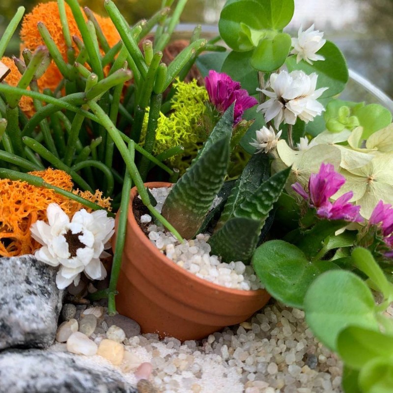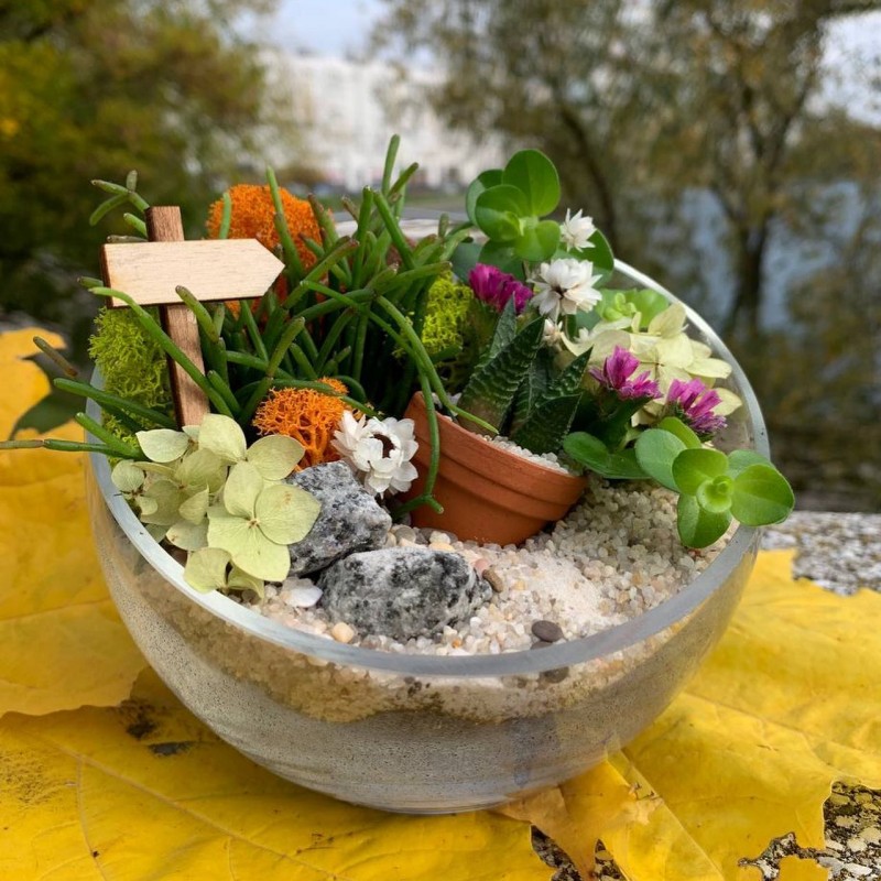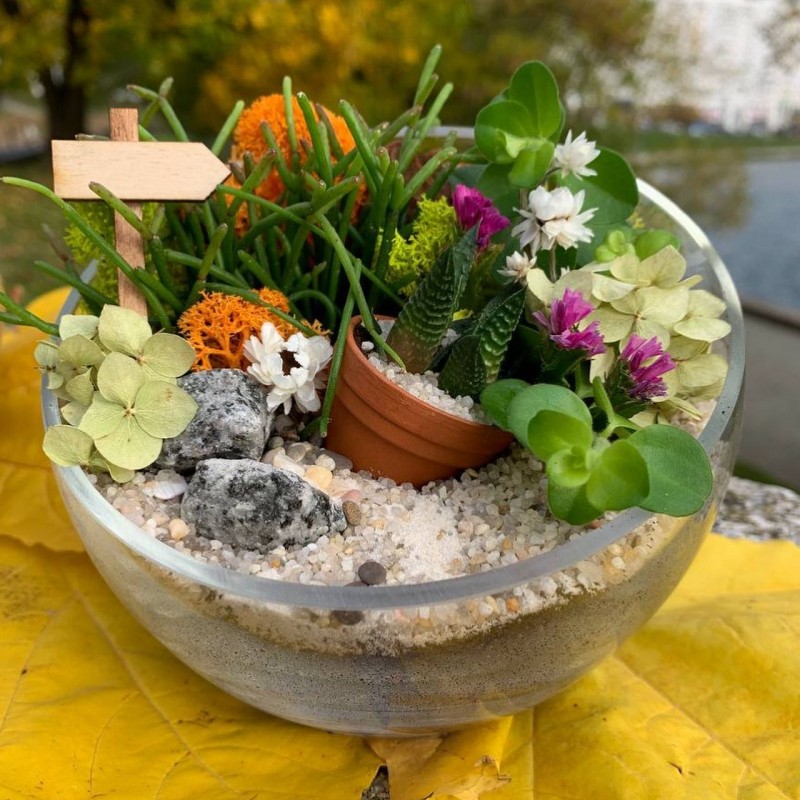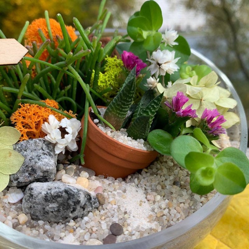 - Декор и сухоцветы: Ягель (мох), Кора сосновая, Пески, камушки и галька (разнообразной фракции), Статица, Аммобиум, Гортензия