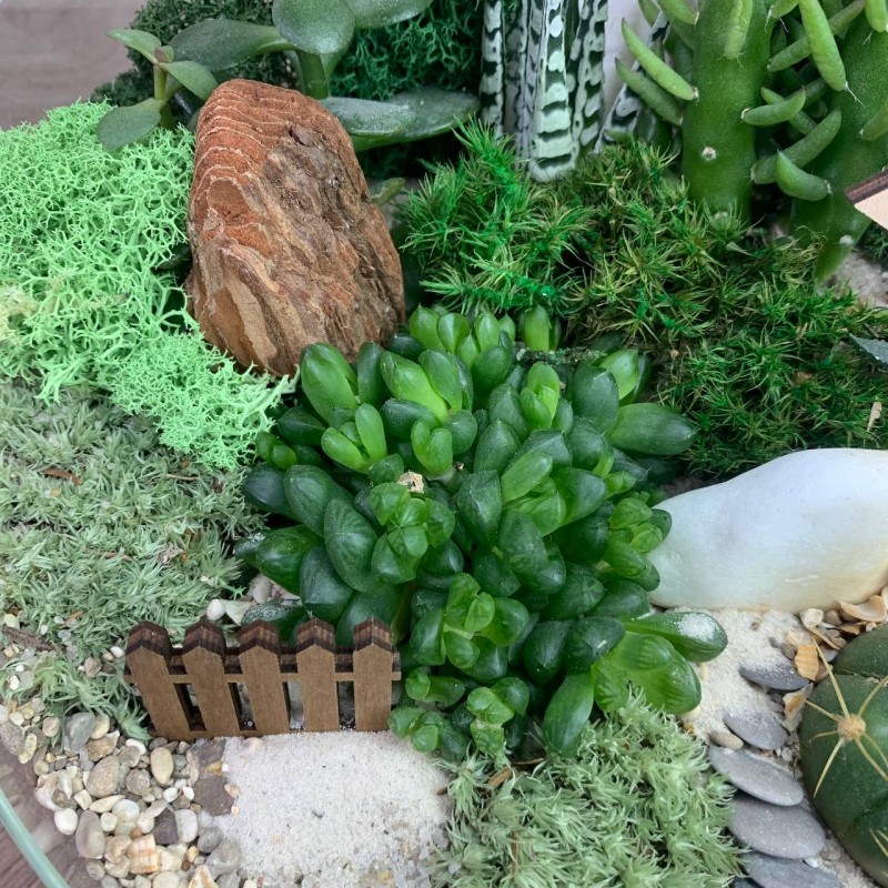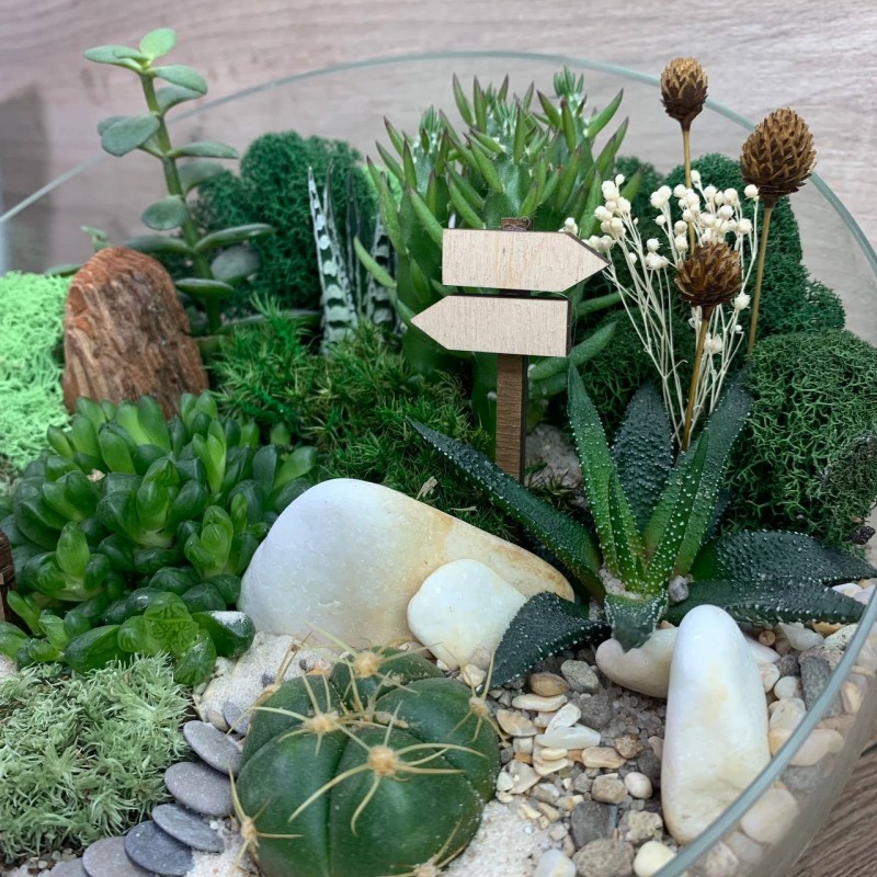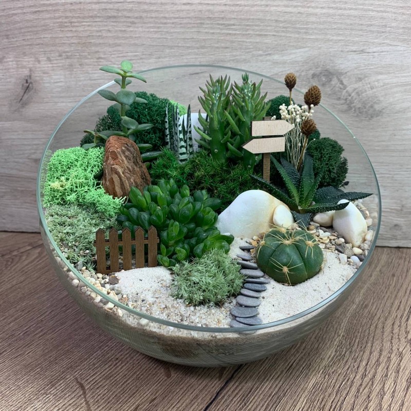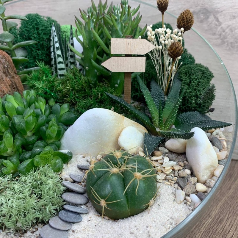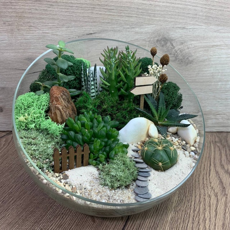 Создать особенный интерьер в помещении помогут миниатюрные садики за стеклом. Частичка природы, внесенная в обыденную обстановку, наполнит помещение сочными оттенками зелени. Не прихотливые суккуленты в составе композиции подойдут для начинающих цветоводов. Натуральные камушки, кора и сухоцветы отлично дополняют композицию флорариума.