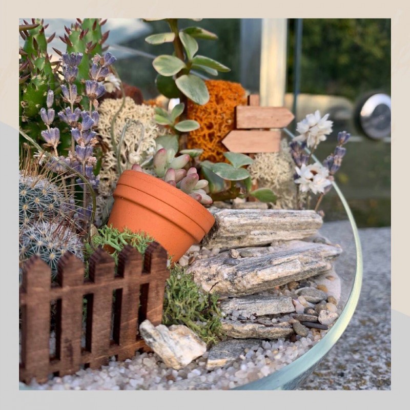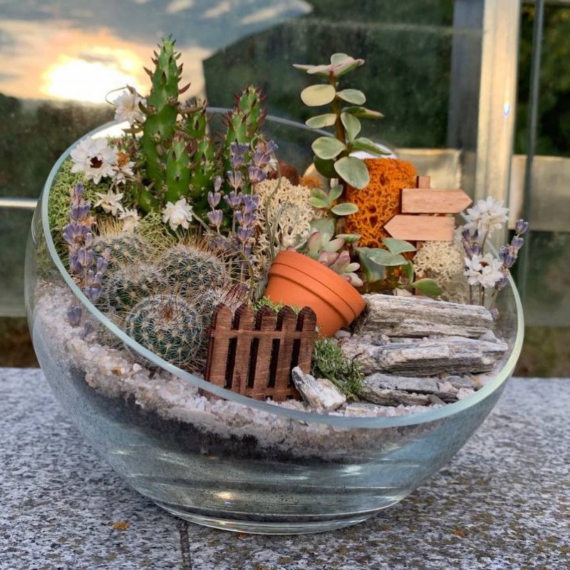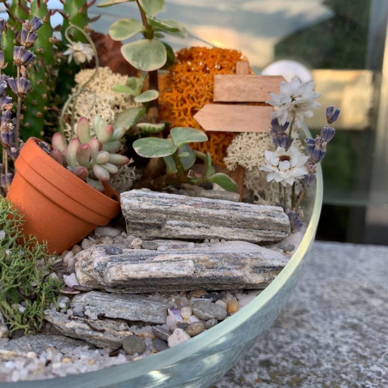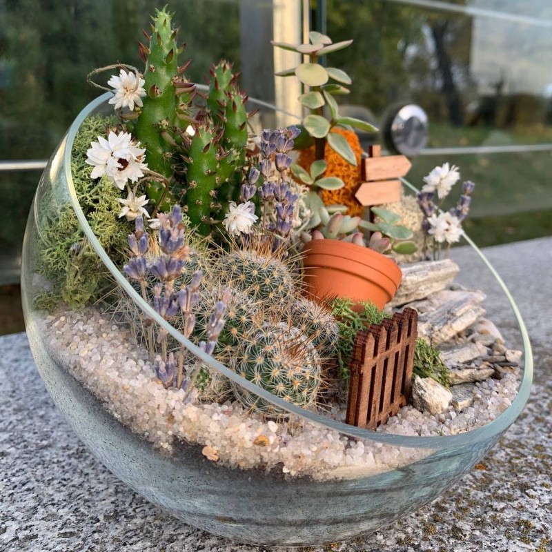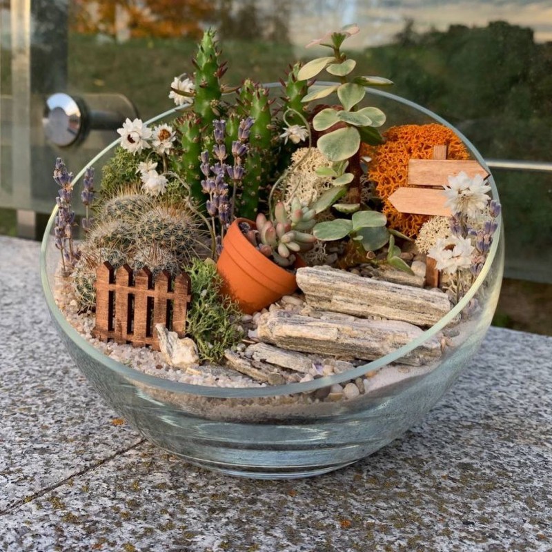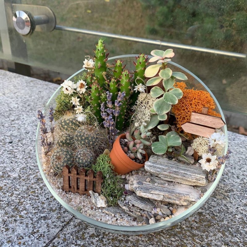 Создать особенный интерьер в помещении помогут миниатюрные садики за стеклом. Частичка природы, внесенная в обыденную обстановку, наполнит помещение сочными оттенками зелени. Не прихотливые суккуленты в составе композиции подойдут для начинающих цветоводов. Натуральные камушки, кора и сухоцветы отлично дополняют композицию флорариума.