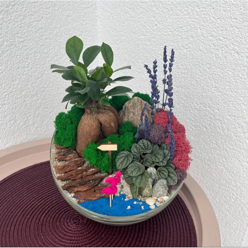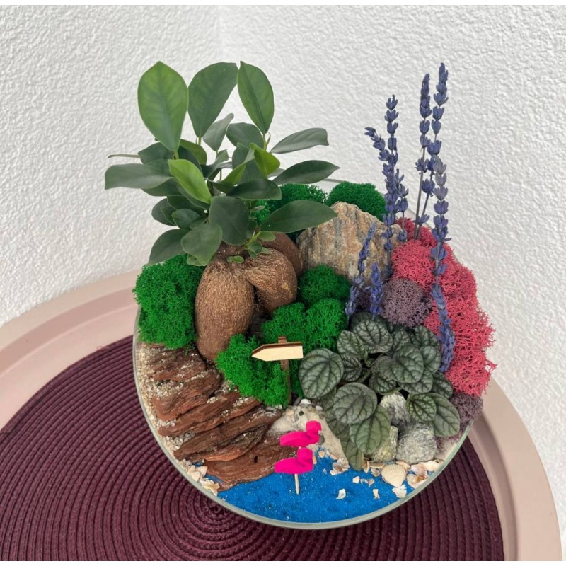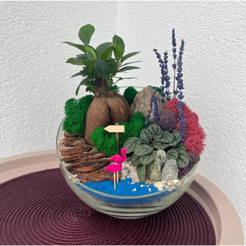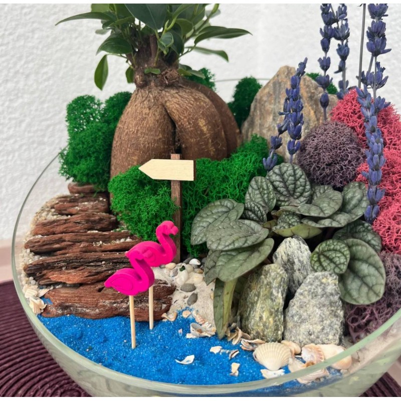 Такой мини-садик подойдет для любителей сочной зелени. Композиция флорариума с фикусом Гинсенг и пеперомией всегда будет напоминать о тёплых солнечных днях. Сочные оттенки мха ягеля, кора, декоративные посыпки и песок разнообразной фракции создают имитацию прудика и дорожки ведущей в глубь тропических зарослей. Идеальным дополнением данной композиции являются нежные фламинго и ароматная лаванда. Флорариум станет отличным дополнением и изюминкой в любом интерьере.