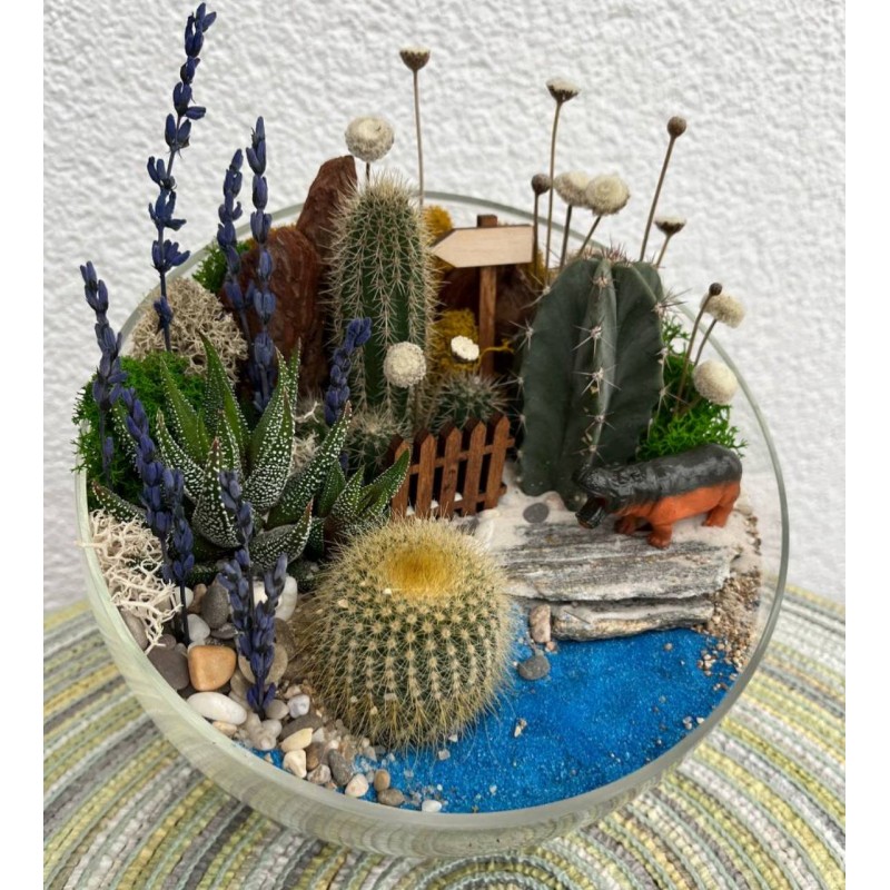 Мини-садик с любимыми суккулентами - кусочек природы у вас дома. В составе роскошные растения, разнообразие фактур, камушки и галька, голубой кварцевый песок имитирующий водоём - целая история, такая большая и интересная история живет в этом флорариуме. Изюминка данной композиции милая миниатюрная фигурка бегемотика. Флорариум - это необычный подарок, который поднимет настроение и отлично дополнят рабочее или домашнее пространство.