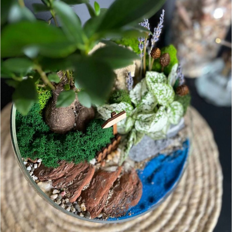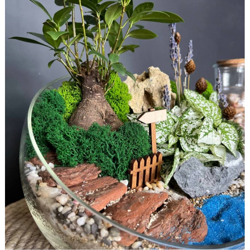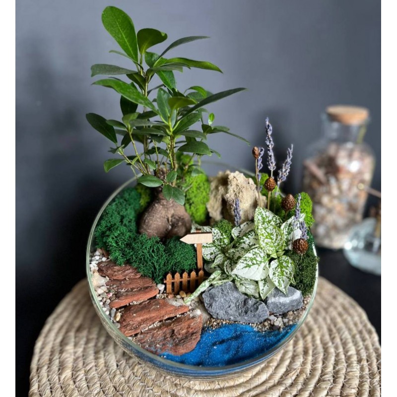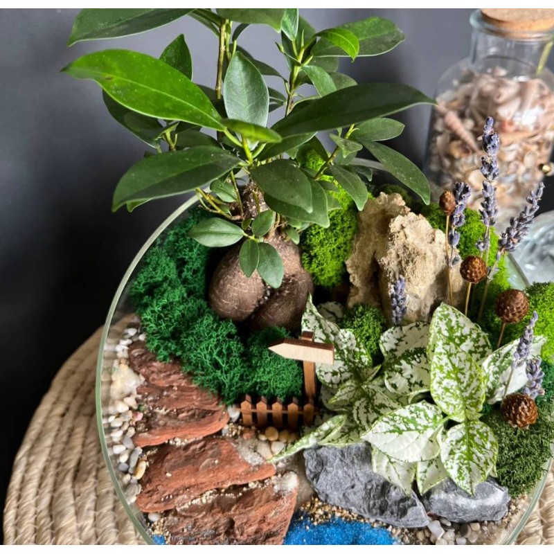 В составе садика любимый бонсай фикус Гинсенг в сочетании с нежной гастерией создают идеальную композицию. Сочные оттенки мха ягеля, кора, декоративные посыпки и песок разнообразной фракции создают имитацию прудика и дорожки ведущей в глубь тропических зарослей. Идеальным дополнением служат лаванда и пиментия. Флорариум станет отличным подарком для самых любимых.