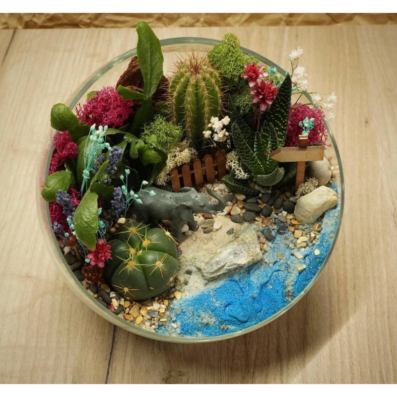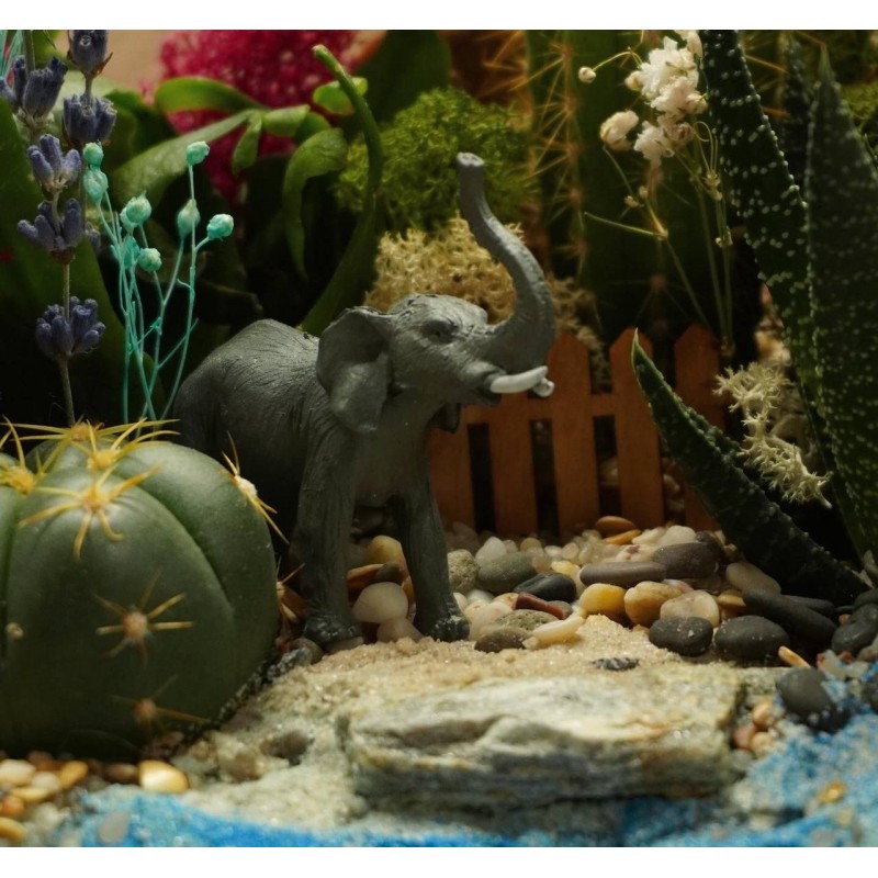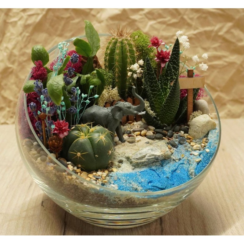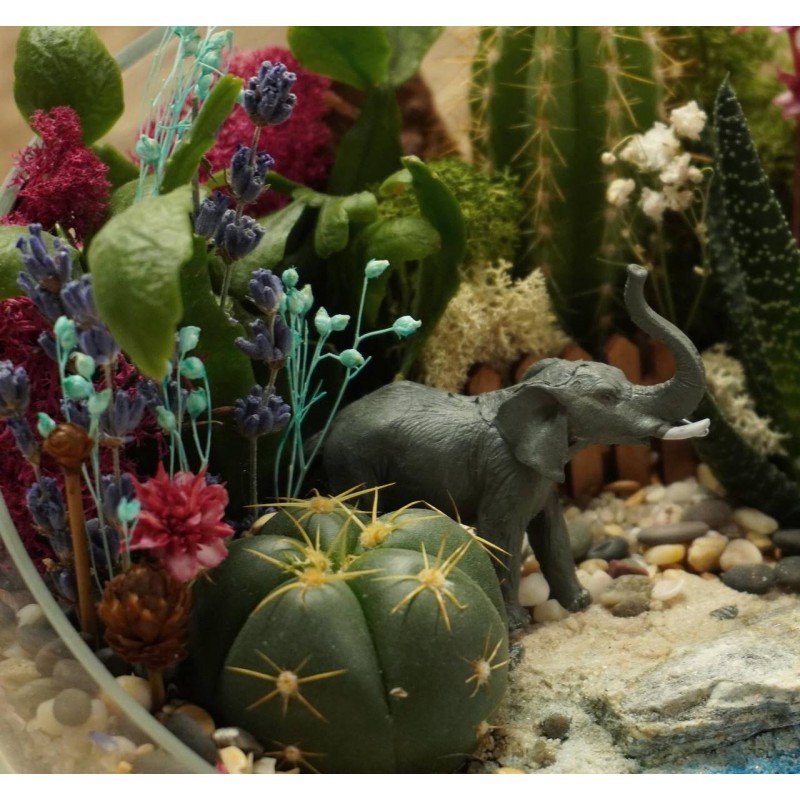 Создать особенный интерьер в квартире помогут миниатюрные садики за стеклом. Частичка природы, внесенная в обыденную обстановку, наполнит помещение яркими натуральными красками. Не прихотливые суккуленты в составе композиции подойдут для начинающих цветоводов. В нашем волшебном садике живет слон, гуляя по тропинкам нашего сада он приходит на берег, к воде.