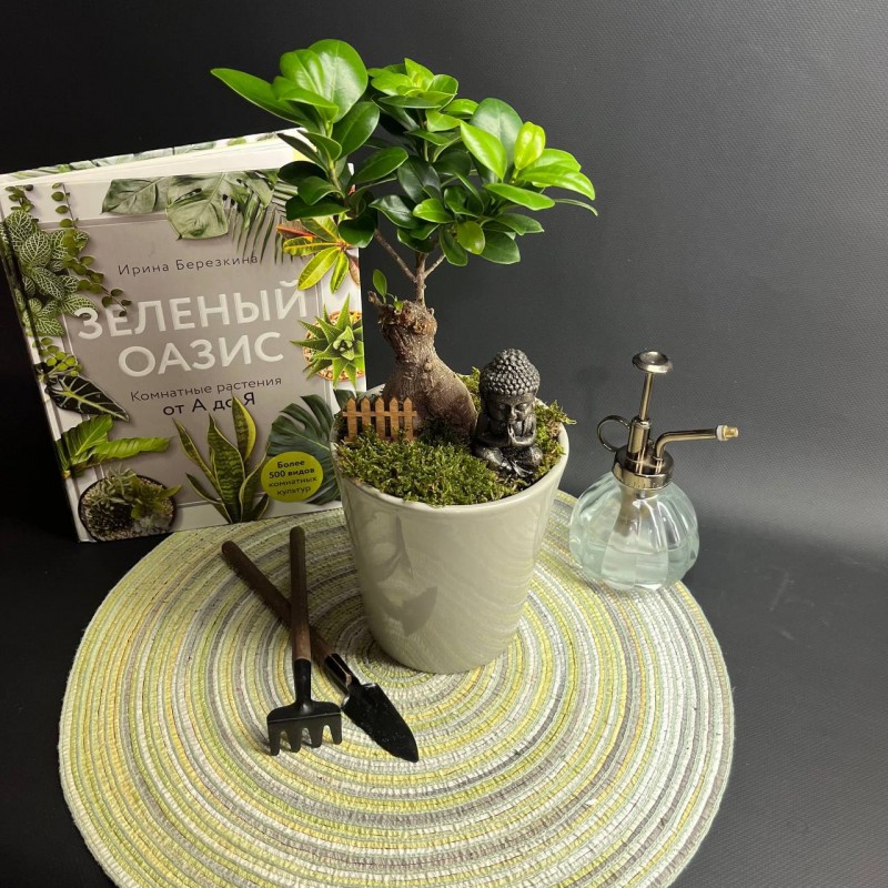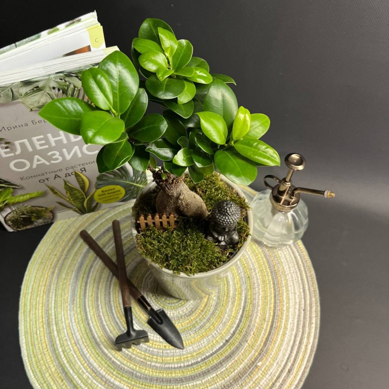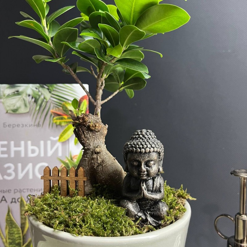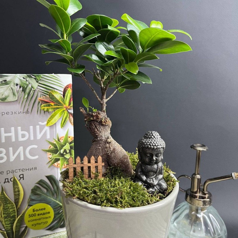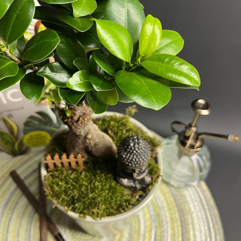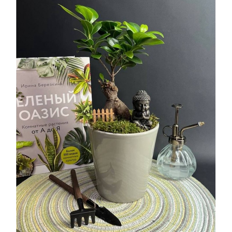 Композиция в керамическом кашпо с бонсаем фикусом Гинсенг арт. 088