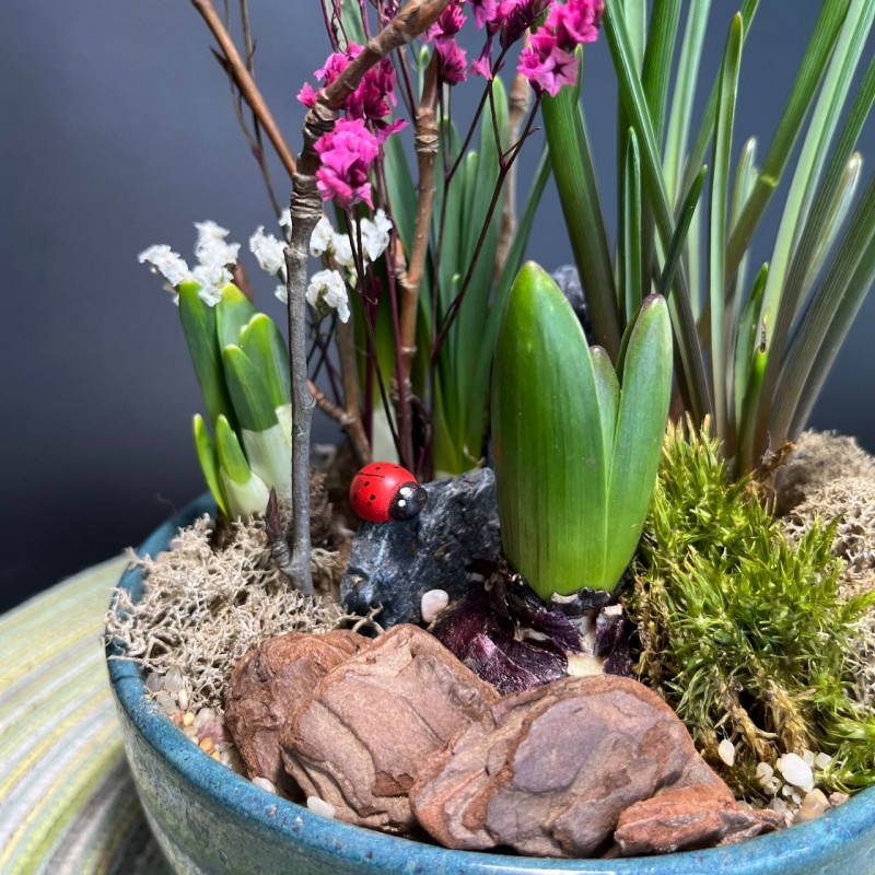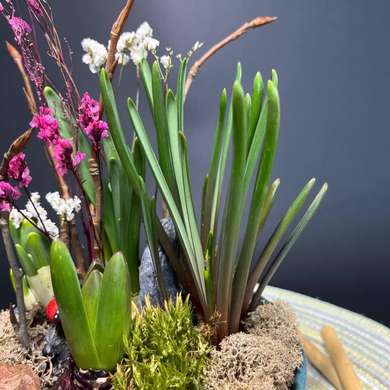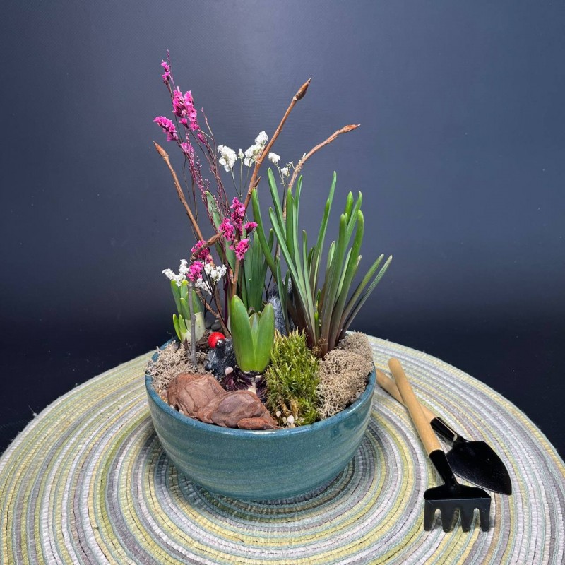 Композиция в керамическом кашпо с первоцветами позволит создать атмосферу уюта и весеннего настроения. Такая весенняя композиция в составе которой нежные мускари, ароматные гиацинты, солнечные нарциссы подойдет для тех у кого нет дачи, но очень хочется прикоснуться к первым весенним цветам. Или заядлым дачникам, которые с нетерпением ждут открытия сезона. Все растения многолетние, что дает возможность наслаждаться их красотой не один сезон.