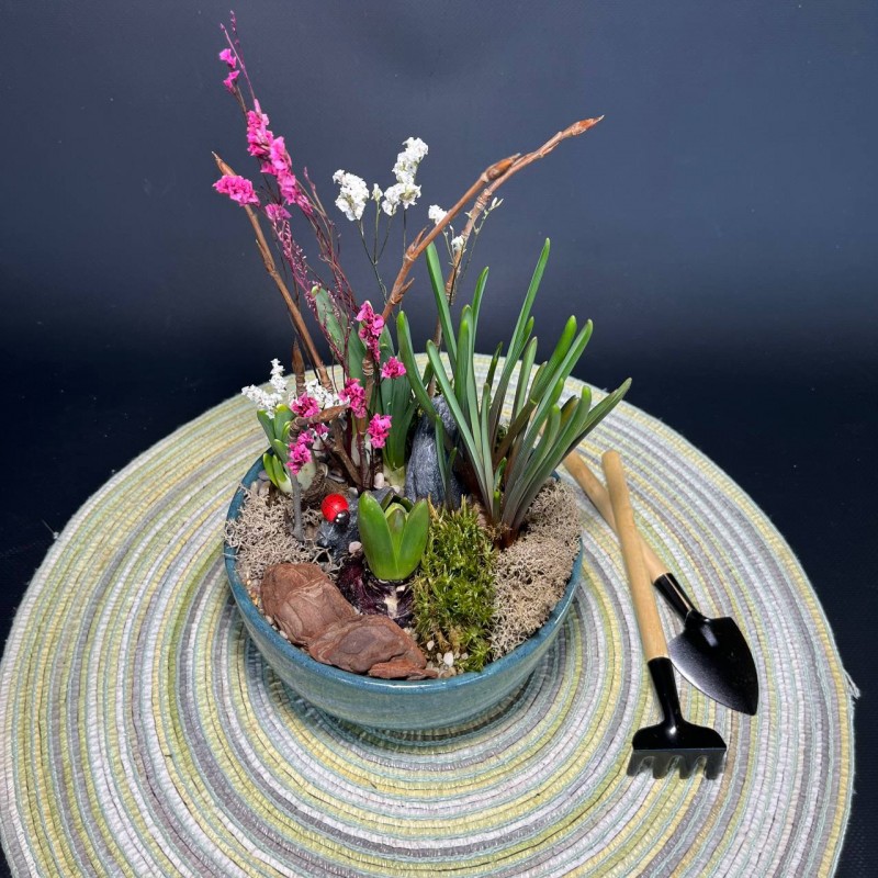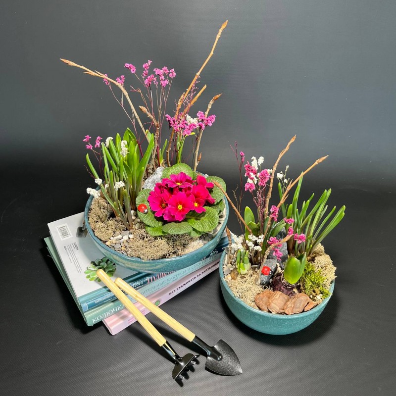 Мы бережно и красиво упаковываем ваш сад, помещая его в крафт пакет с атласными лентами в цвет. Также вы получаете миниатюрный конверт с логотипом компании в котором сможете найти подробную информацию по уходу и небольшую открыточку-комплимент ( ее можно выбрать при оформлении заказа или в разделе "аксессуары" и даже подписать если сад в подарок ).