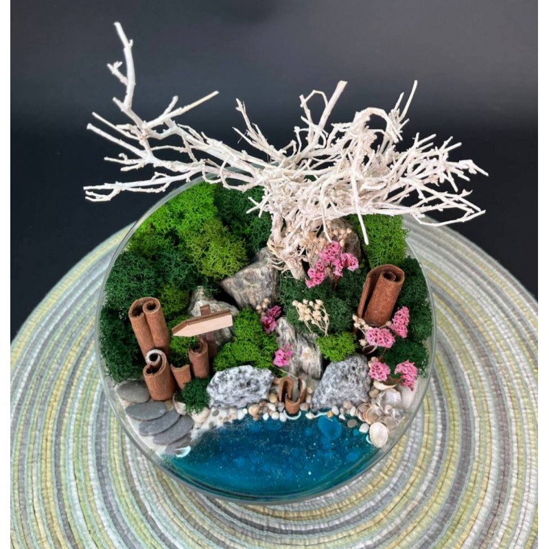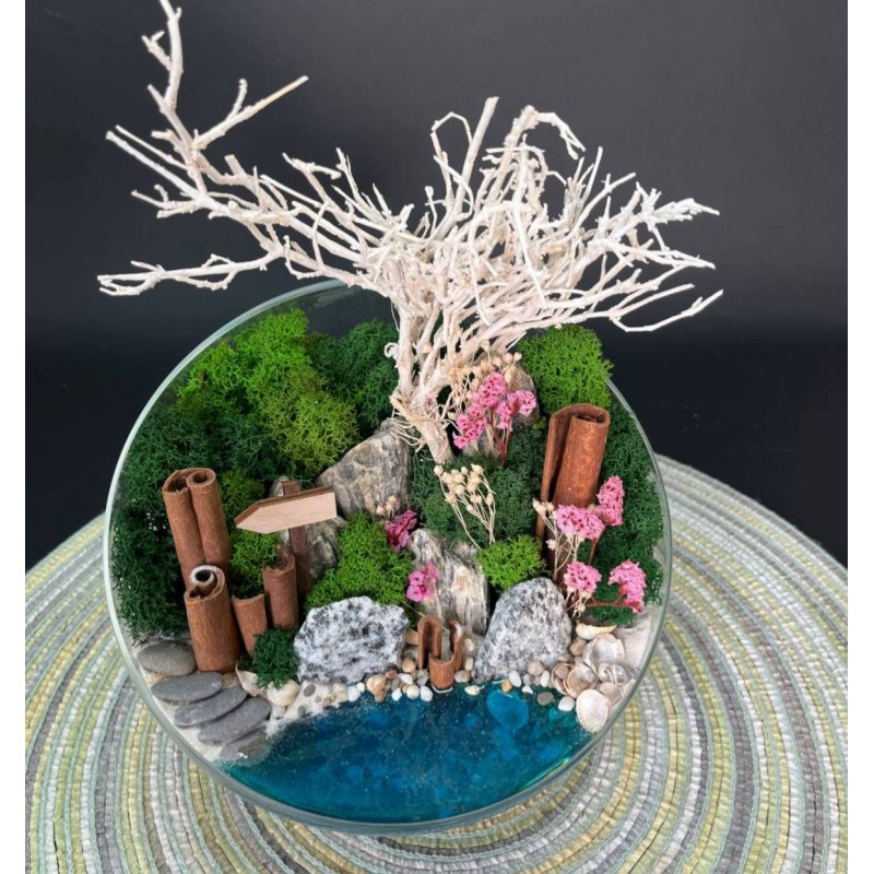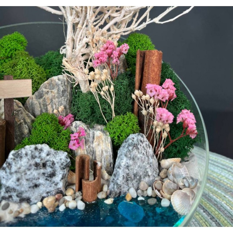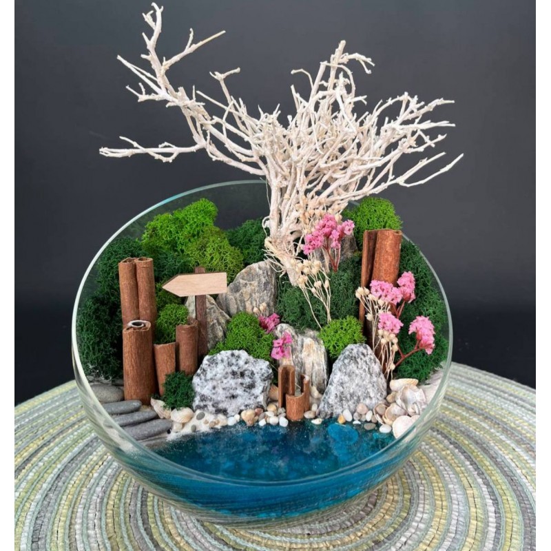 - Декор и сухоцветы: Брум-блум, Ягель (мох), Палочки корицы, Пески, камушки и галька (разнообразной фракции), Горная порода